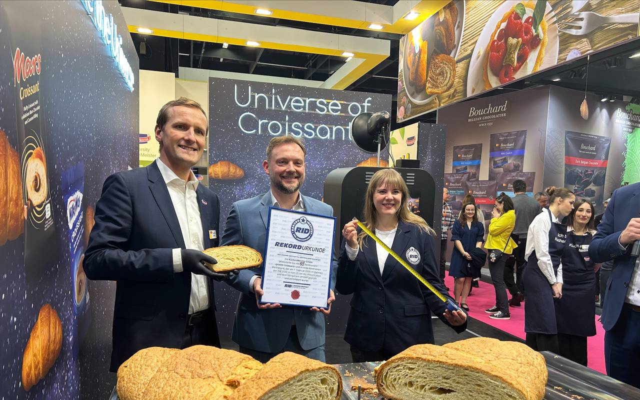 Das Croissant wurde von der Großbäckerei Kuchenmeister in Soest gebacken und dann nach Deutz transportiert, wo es auf der Süßwarenmesse offiziell zum Weltrekord erklärt wurde. Matthias Weber, einer der Mitentwickler von Kuchenmeister, erklärte, dass der Rekord nicht ganz so einfach zu erreichen war. Es habe im Vorfeld 20 Versuche gegeben. Das Ergebnis kann sich sehen lassen: Ein buttrig-fluffiges Croissant, das mit satten 900 Gramm Fett definitiv kein Leichtgewicht ist. (RO|GR)