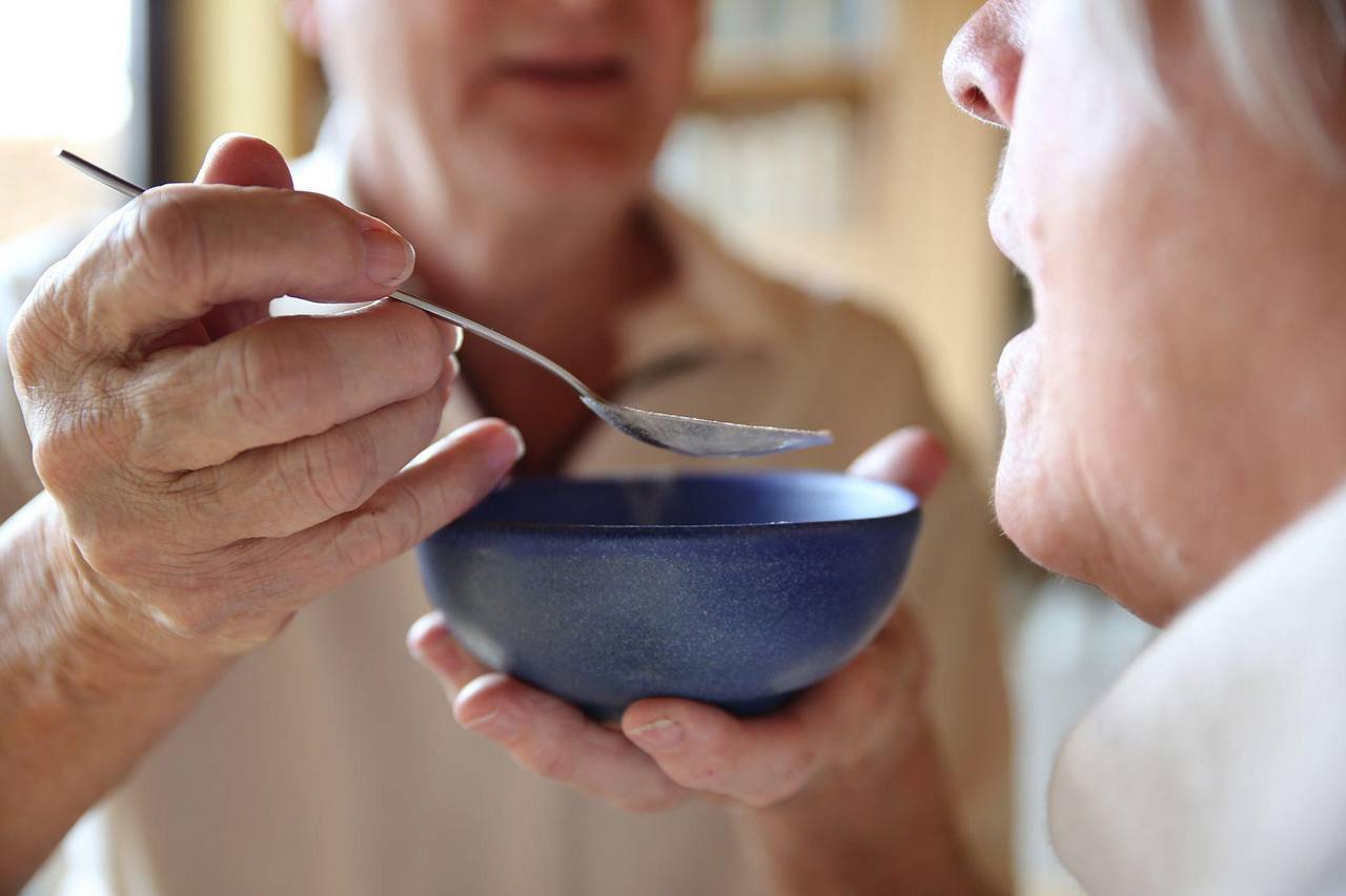 Ein Mann gibt einer zu pflegenden Person etwas zu essen