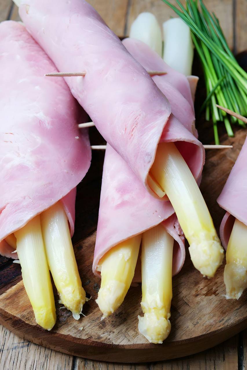 - Die Schinkenscheiben mit je einer Scheibe Gouda und zwei Spargelstangen belegen. Alles zusammenrollen und mit einem Zahnstocher fixieren.