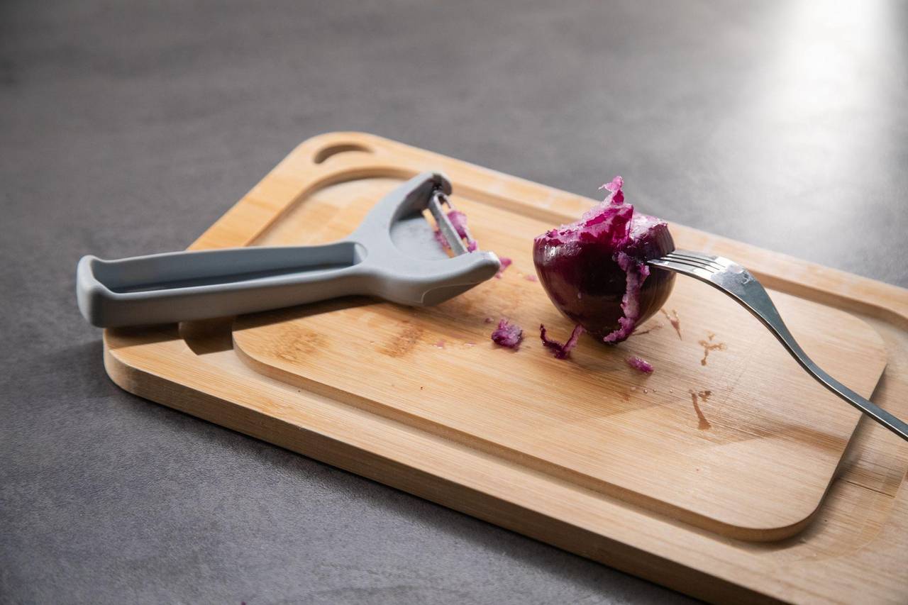 Und so geht's: Mit der einen Hand die Zwiebel mit einer Gabel fixieren und mit der anderen Hand mit einem Schäler über die Zwiebel fahren.