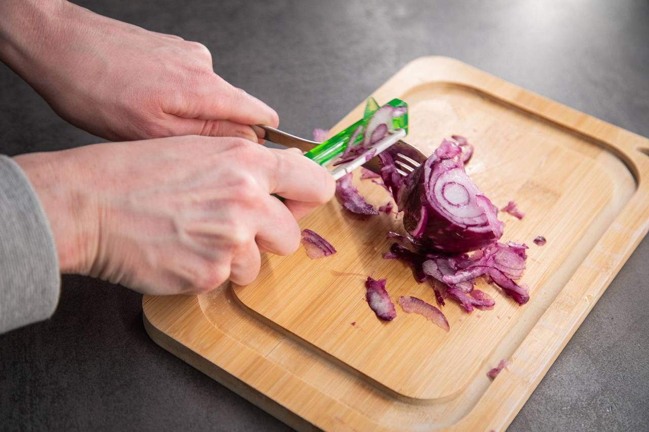 Berlin (dpa/tmn) - Zwiebeln schneiden: Für viele ist das eine eher lästige Küchenaufgabe. Auf dem klassischen Weg mit Brett und Messer fallen Zwiebeln leicht auseinander, rutschen leicht weg und lassen gerne mal die Augen tränen. Gibt es vielleicht einen Trick, mit dem das schneller und einfacher geht?